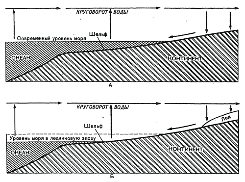 Когда в ледниковую эпоху температуры снижались, большая часть осадков выпадала в виде снега и меньшая - в виде дождя. Образовались ледники. Поскольку в море теперь возвращалось меньше воды, потому что большая часть ее, участвующая в круговороте, накапливалась на суше в виде льда, глубина моря должна была уменьшаться.