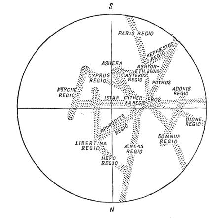 Карта Венеры, опубликованная Ловеллом вместе со статьей в 1897 г., очень характерна для его работ. На карте представлены открытые и названные им детали, а вся картина совершенно не похожа на ту, которую мы привыкли наблюдать на Венере.