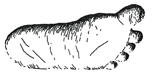 Рис. 75. Гипсовый слепок со следа неандертальца на пластичном глиняном полу пещеры в Италии. Форма ноги более широкая и более неправильная,чем у современного человека.