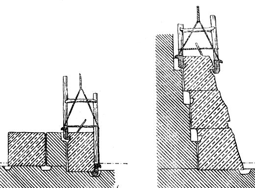 Все эти камни доставлялись на деревянных санях. На толстых плитах дорог можно видеть глубокие борозды от полозьев, свидетельствующие о том, что здесь в течение долгого времени возили огромные тяжести. При изучении некоторых памятников древнеегипетскою зодчества ученые обратили внимание на множество правильно расположенных углублений, сделанных в больших камнях. Эти ямки как бы отмечали углы квадратов, расположенных по одной линии. Как выяснилось, при укладке больших блоков весом в несколько десятков тонн строители пользовались особыми приспособлениями. Они состояли из деревянных брусьев, скрепленных с помощью веревок с медными крючьями для держания блоков. В камнях, на которые собирались опустить блок, делались ямки с таким расчетом, чтобы когти, держащие камень, числом 4 и 6, попали в эти ямки и утопились в них. После того как камень был поднят и опущен затем на место, веревки, держащие когти, отвязывались и вынимались из ямок. Сами медные крючья до нас не дошли, но, судя по зелени (ярь-медянке) и по следам, оставленным в камнях, их удалось реконструировать.
