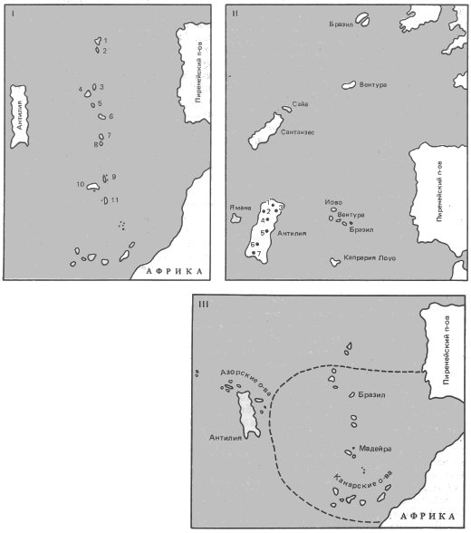 Рис. 6. Реальные и мифические острова на древних картах. На первой схеме изображена Антилия и остров Св. Брандана (карта Бартоломео Пареты, 1455 год). Названия островов: 1 – Корруи марини, 2 – Ли коникри, 5 – Сан-Зорзо, 4 – Вентура, 5 – Колломби, 6 – Бразил, 7 – Капрария, 8 – Лоуо. Южнее мифических островов расположены реально существующие: 9 – Порту-Санту, 10 – Мадейра, 11 – Дезерташ и Канарские острова. На второй схеме изображена карта Армандо Кортеса, 1424 года. На Антилии указаны семь городов: 1 – Ари, 2 – Асаи, 3 – Вра, 4 – Яйсос, 5 – Марульо, 6 – Ансули, 7 – Кионде. На третьей схеме изображена карта Кутиньо, 1424 года. Прерывистой линией показан путь каравелл, которые на обратном пути от африканского побережья в Европу были унесены сильным юго-восточным ветром далеко на запад от берегов Африки. Масштаб карт приблизительно 1:30 000 000