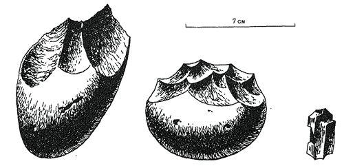Рис. 77. Два галечных орудия; одно очень грубое, другое сделано более искусно. Полученный при изготовлении отщеп мог использоваться для снятия шкур.