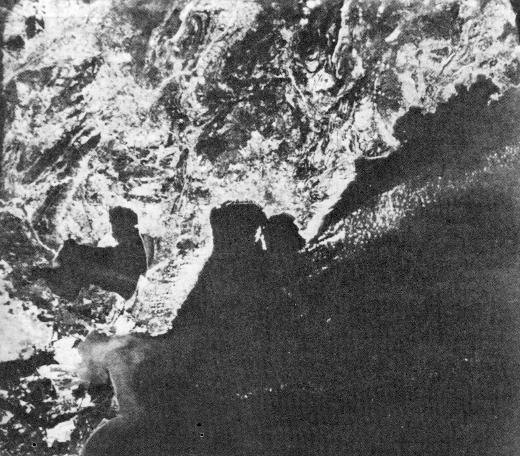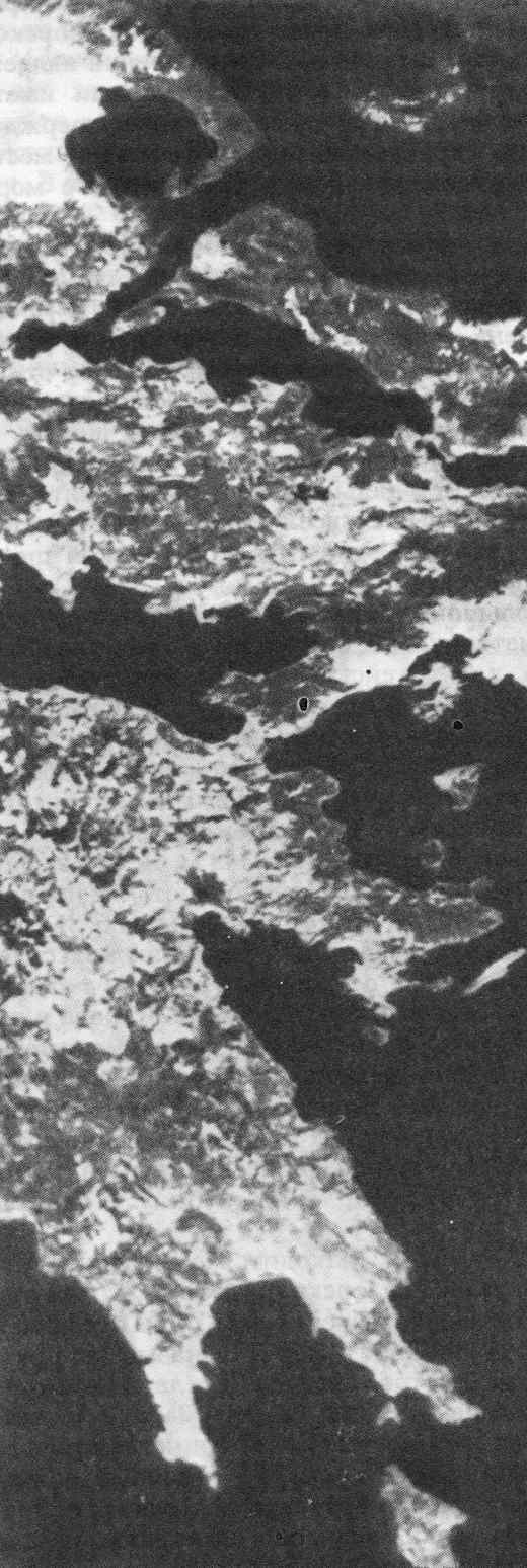 Фото 8. Снимок части греческой территории (в том числе почти всего Пелопоннеса) Он составлен из трех кадров, сделанных cо спутника ERTS. Масштаб приблизительно 1:1 400 000. Коринфский залив (в центральна части снимка), несмотря на небольшую площадь, имеет большие глубины. Скалистое I расчлененное юго-восточное побережье Пелопоннеса резко уходит под воду. Некоторые горы юго-восточной части Пелопоннеса вполне могли считаться Геркулесовыми столбами