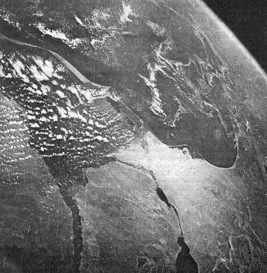 Фото 10. Юго-восточная часть Средиземного моря, снимок со спутника. Далеко в море уходит надводная и подводная часть дельты Нила