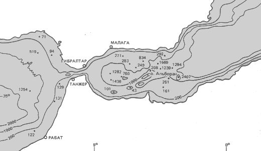 Рис. 18. Батиметрическая карта моря Альборан у Гибралтарского пролива. Здесь расположено несколько хребтов и возвышенностей, а также впадина, достигающая глубины 1500 м. (По данным Д. Стэнли, 1972)