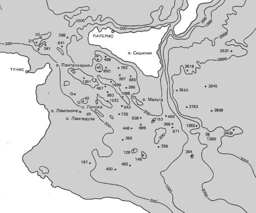 Рис. 19. Батиметрическая карта района Средиземного моря между Сицилией и Тунисом. Здесь между широкими шельфами Африки и Сицилии есть только небольшие глубоководные проходы. Но нарастание глубин в них происходит очень резко. (По данным Д. Стэнли, 1972)