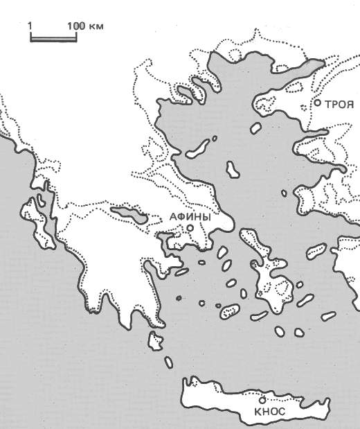 При понижении уровня воды хотя бы на 100 м Эгейское море может неузнаваемо измениться (рис. 20). Сушей станет почти вся его центральная и южная часть, широкий шельф Малой Азии на востоке и почти половина северной части. Под водой останутся только небольшие котловины и большая депрессия на севере. Эвстатические колебания уровня моря должны были оказывать здесь большое влияние на распределение моря и суши. В недавнем же геологическом прошлом не меньшую роль играли и тектонические процессы. Как мы уже говорили, Эгейское море возникло на месте распавшейся суши. Опускание началось во время альпийского тектогенеза, то есть с конца миоцена, и продолжается по сей день. Почти все морское дно было сушей, но, к сожалению, не 11 500, а 10 млн. лет назад. А это уже большая разница. 11 500 лет срок слишком малый для того, чтобы суша на значительном пространстве сменилась морем. Да и то только в том случае, если бы произошла какая-нибудь крупная катастрофа, например вулканическое извержение на острове Тира или землетрясение. Однако до сих пор на дне моря не было найдено ничего такого, что можно было бы считать открытием древней, неизвестной до сих пор цивилизации.