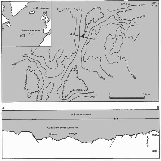 Рис. 22. Область Срединно-Атлантического хребта, где в рамках проекта ФАМОУС проводились тщательные исследования с помощью подводных аппаратов. В левом верхнем квадрате показаны границы этой области. На верхнем рисунке изображена морфология дна этого района, на нижнем – профиль вдоль линии А – В. Видно, что рифтовая долина отделена от соседних возвышенностей крутыми склонами. На дне долины располагаются молодые вулканические горы. (По Кс. Ар-циану, 1975)