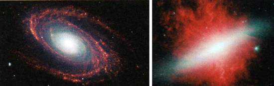 Спиральная галактика М81 (слева) и неправильная галактика М82 (справа). Составные изображения, полученные с помощью снимков с земли и из космоса.