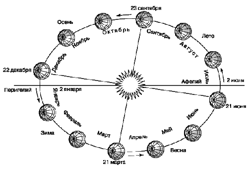Путь Земли вокруг Солнца, или орбита, – эллипс, близкий к окружности. Расстояние от Земли до Солнца в январе – 147 млн. км (в перигелии), в июле – 152 млн. км (в афелии). Длина орбиты – более 930 млн. км, скорость движения Земли по орбите – около 30 км/с, время обращения – 365 суток 6 часов 9 минут 9 секунд. Ось вращения Земли наклонена к плоскости орбиты под углом 66,5°. Наклон земной оси – причина неравенства дня и ночи и смены времен года на Земле.