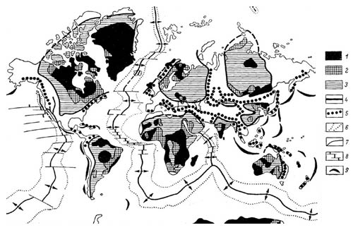 Главные тектонические структуры современной Земли. Материки: 1 – докембрийские платформы; 2 – щиты; 3 – древние ядра платформ; 4 – первичные дуги (поясы Альпийского орогонеза, зоны сжатия); 5 – офиолитовые зоны. Океаны: 6 – контуры срединно-океанических хребтов; 7 – рифтовые долины (зоны растяжения); 8 – поперечные разломы; 9 – глубоководные желобы.