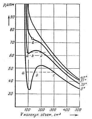 Изотерма при 0°C показывает, что с возрастанием давления объем сперва уменьшается, но до некоторого максимума давления; затем объем продолжает уменьшаться, но давление падает до некоторого минимума, так что для каждого данного давления мы имеем два объема. На практике состояния, выражаемые изломами кривой, неустойчивы — здесь газ превращается в жидкость.