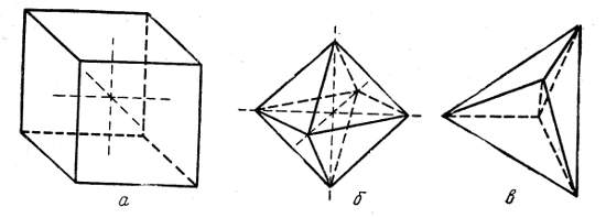 Рис. 1. Основные фигуры симметрии: а — куб, б — октаэдр, в — тетраэдр
