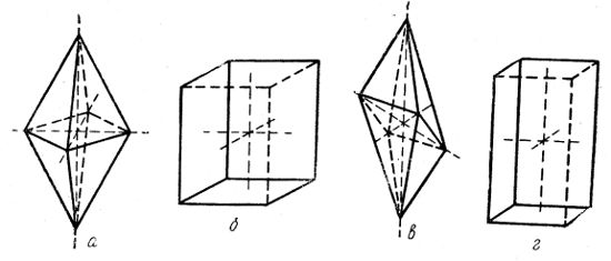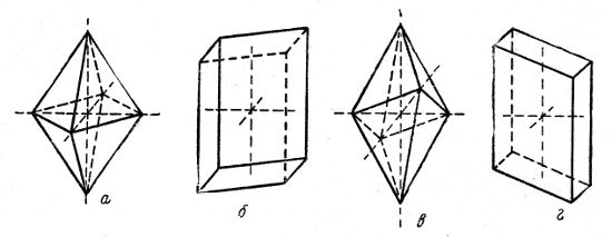 Рис. 4. Многогранники: а — моноклиноэдрическая пирамида; б — моноклиноэдрическая призма; в — триклиноэдрическая пирамида; г — триклиноэдрическая призма