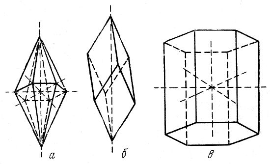 Примерами форм гексагональной системы могут служить гексагональная бипирамида (рис. 3, а), ромбоэдр (рис. 3, б) и гексагональная призма (рис. 3, в).