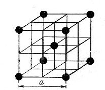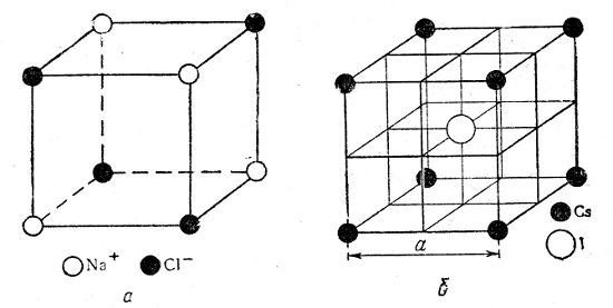 Кристаллическая решетка Cs+I (рис. 7) представляет собой сочетание двух простых кубических решеток: решетки иона Cs+ и решетки иона I, вдвинутых одна в другую так, что в центре куба находится ион иода, а в углах — ионы Cs+. Эта решетка центрирована в пространстве с той лишь разницей, что в центре куба находится анион, а в углах — катионы.