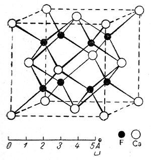 Кристаллическая решетка Ca2+F2 типична для многих тройных электролитов (рис. 8). Здесь ионы Ca2+ образуют кристаллическую центрированную в гранях решетку, ионы же F расположены в срединах 8 маленьких кубов, на которые может быть разложен большой куб.