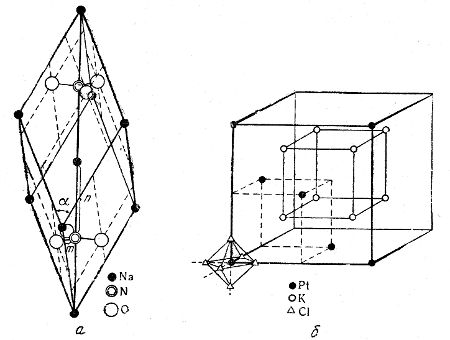 Рис. 9. Кристаллические решетки: а — NaNO3, б — K2[PtCl6]
