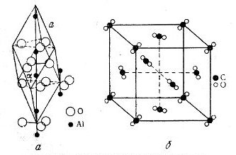 Рис. 10. Кристаллические решетки: a — корунда Аl2O3, б — двуокиси углерода CO2