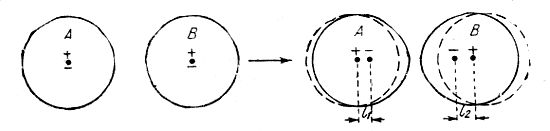 На рис. 12 показан сдвиг электронов под влиянием заряда соседнего иона с образованием индуцированных диполей с деформированной электронной оболочкой (Фаянс). При сближении ионов каждый из них является диполем. Это, конечно, оказывает влияние на группировку таких ионов в кристаллической решетке. При дальнейшем сближении деформированных ионов и далеко идущей их взаимной поляризации получается неполярная (атомная) молекула.