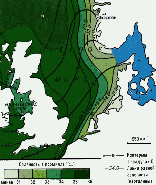 Соленость на преобладающей части Ирландского моря близка к океанической, и только на прибрежных участках под влиянием речного стока она несколько понижена. В распределении солености в течение года существуют сезонные различия. В общем соленость несколько выше на юге и на востоке и ниже на севере и западе моря. Характерная особенность ее распространения — язык несколько более соленых вод, вытягивающийся с юга на север вдоль всей срединной глубокой части моря. Зимой, в феврале, наибольшая соленость на поверхности, равная 34,6— 34,7‰, наблюдается на крайнем юге центрального района моря. Отсюда она постепенно уменьшается к северу и на северной окраине равна 34‰. Ее меньшие величины (32—32,5‰) отмечаются у северо-восточного побережья, откуда соленость заметно увеличивается к западу и юго-западу и в средней части моря равна 34—34,2‰. Вдоль западного побережья соленость равна 34,1— 34,2‰. С глубиной соленость увеличивается незначительно, у дна она только на 0,1—0,15‰ больше, чем на поверхности.
